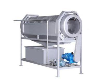 單機由機架、傳動電機、傳動罩殼、滾筒、噴淋管、集水槽、高壓噴嘴等部件組成。其中滾筒為其主要結構,與水平呈3°~5°傾斜角放置,工作時由減速機驅動滾筒轉動。果蔬原料通過輸送機均勻地進入滾筒,滾筒內有不銹鋼管條形排列成圓形,在滾筒內部設有四個階梯制成的多角形,由于滾筒的轉動使物料不斷地翻轉,物料與滾筒表面以及物料與物料表面相互產生摩擦,在滾筒上方安裝了高壓噴淋管,物料翻轉的同時噴淋管噴射高壓水沖洗物料表面,使物料在整個翻轉移動的過程中都能受到充分的沖洗。沖洗出的污水由集水槽收集后排出。物料在清洗過程中,由于滾筒的傾斜,受重力作用從高向低處緩慢移動, 后從出料口排出。